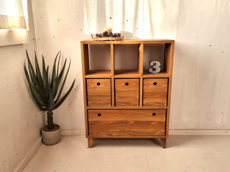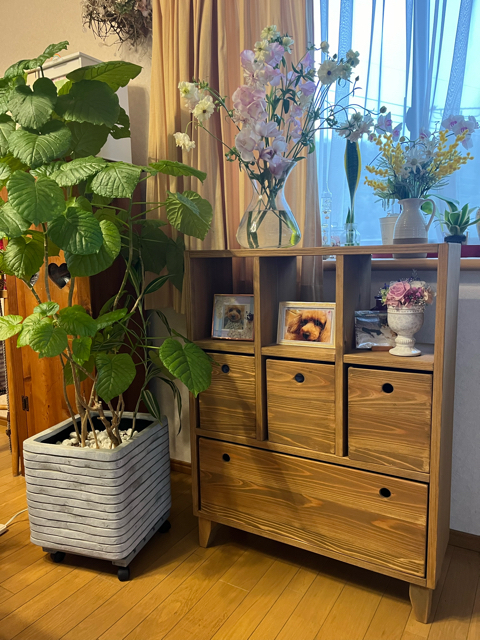 BOX収納と見せる収納、飾る部分があるオシャレなキャビネットになりました。