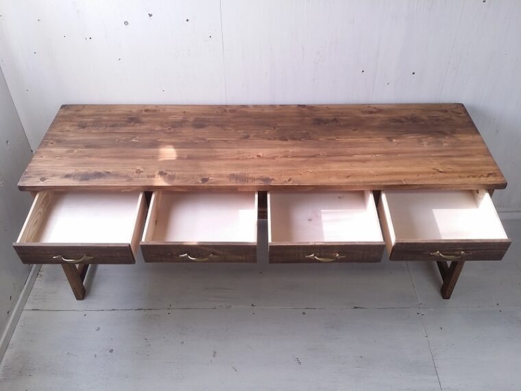 横幅170cm、奥行52cmにサイズアップされ、引き出し4つで