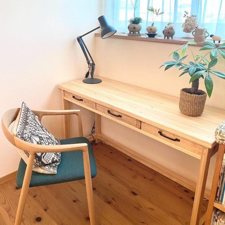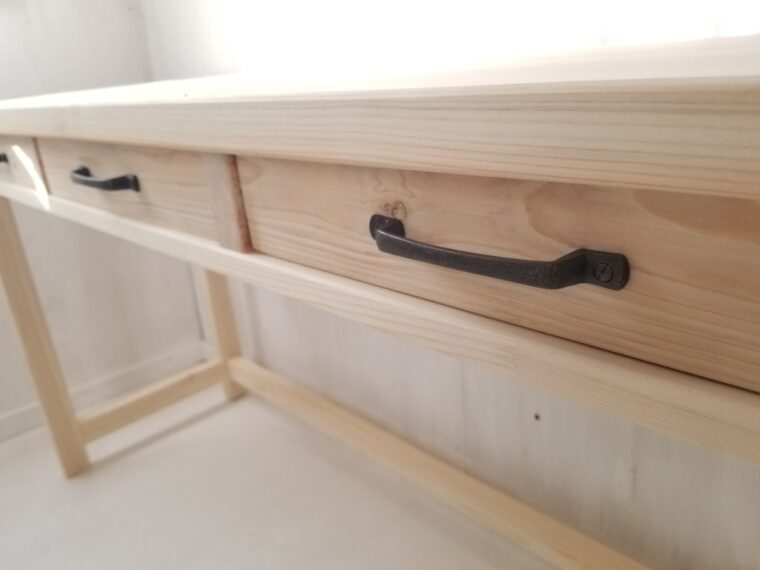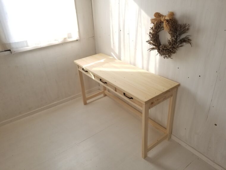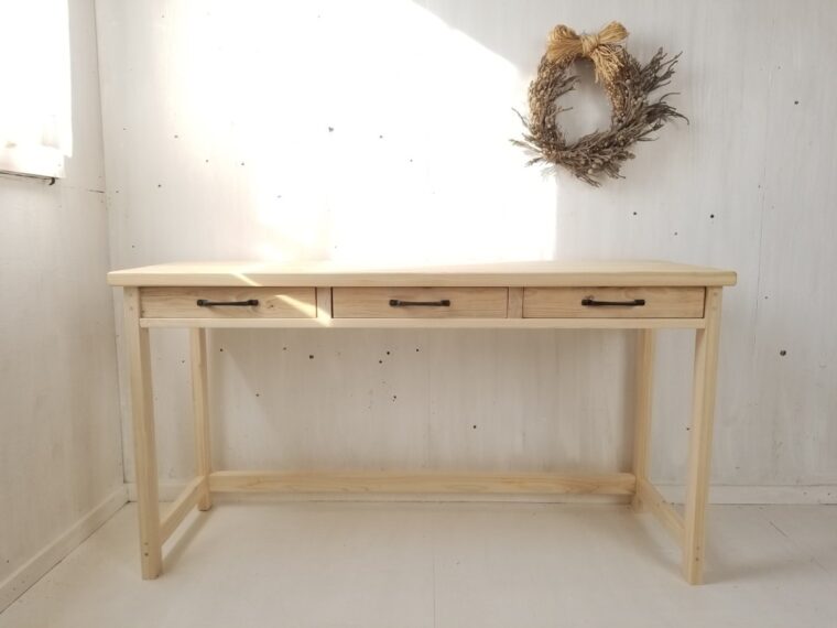 S県O様より130cmのワイドデスクのオーダーをいただきました。無塗装で木目がよくわかるナチュラルな雰囲気とO様ご指定のアイアン取っ手がポイントになりました。