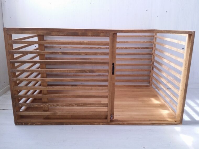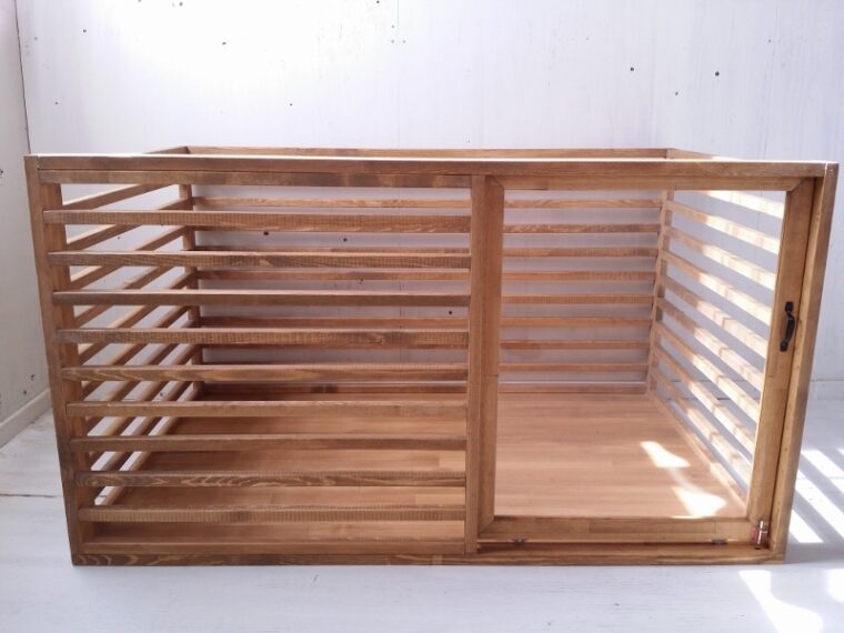 長野県A様より、犬小屋のオーダーです通気性の高いサークルタイプで屋根も無い仕様です。設置場所の条件により、側面と背面は2cm低く製作となりました。
