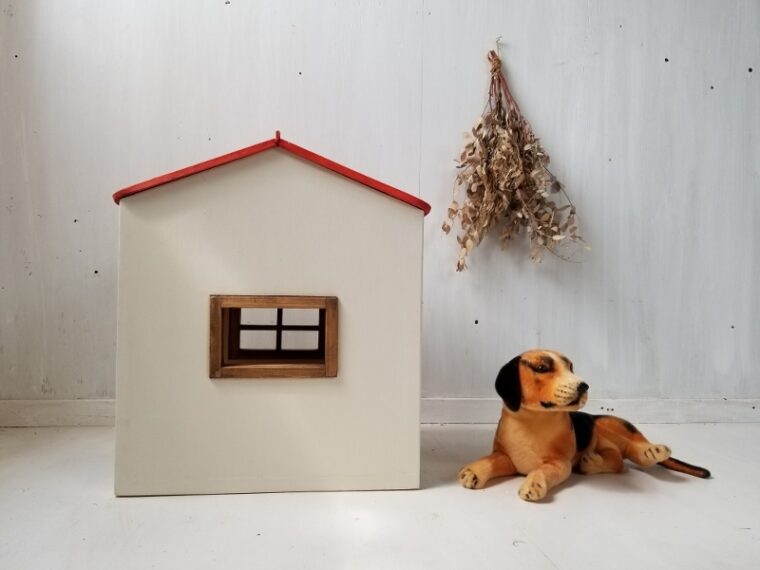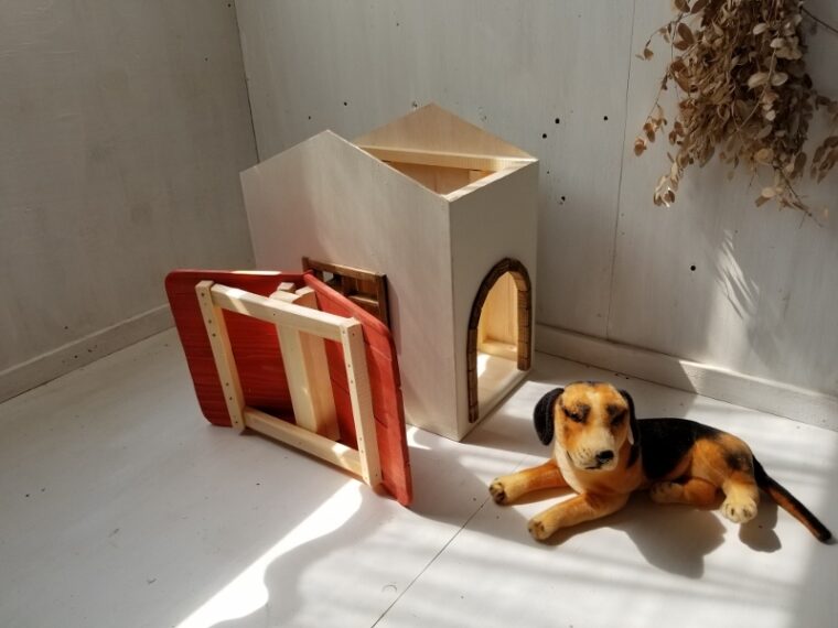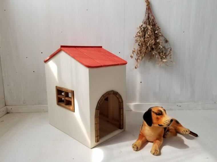 千葉県I様よりオーダーいただいたのは、入り口から縦長にされて、3面共に窓を取り付けられたドッグハウスです。しろ×あか×茶のかわいい組み合わせです。