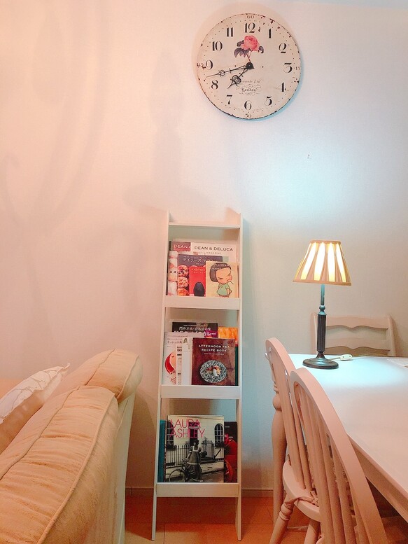 マガジンラックです。白と優しいランプの光が素敵ですね。