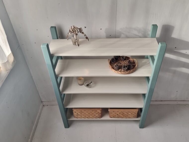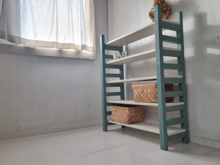 このラックのアンティークブルー部分は、Old Village社製のバターミルクペイントを