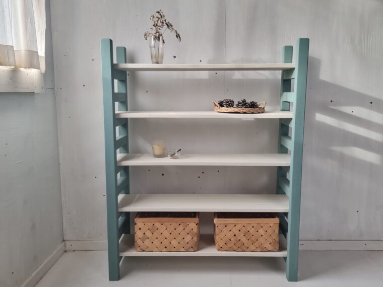 このラックのアンティークブルー部分は、Old Village社製のバターミルクペイントを